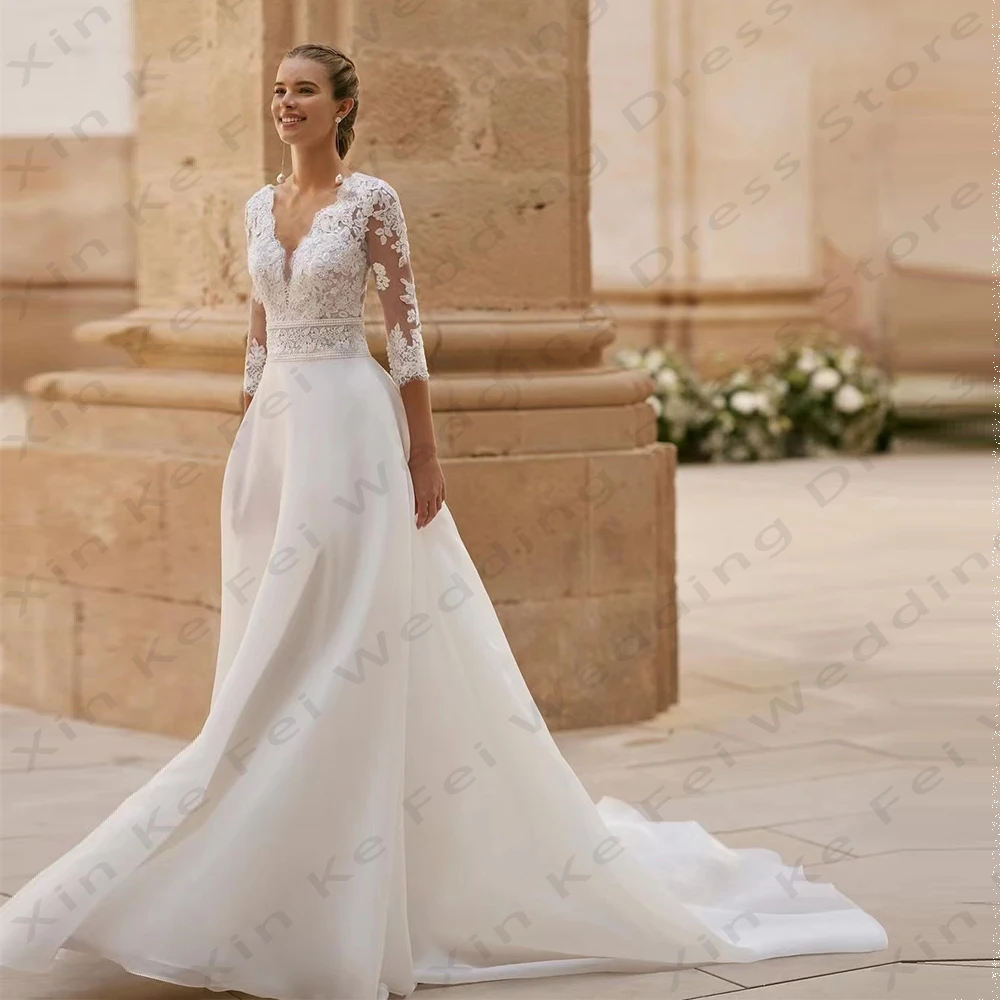 Elegant Women’s V-Neck Wedding Dressees Lace Applique Long Sleeved Princess A-Line Bridal Gowns Formal Beach Party Welcome Guest